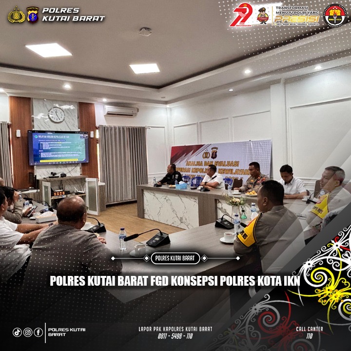 Kutai Barat – Rabu, 23 Juli 2025, Polres Kutai Barat menggelar Focus Group Discussion (FGD) yang membahas Konsepsi Polres Kota Kawasan Ibu Kota Nusantara (IKN) dan Wilayah Hukum Kepolisian di IKN. Kegiatan berlangsung di Ruang Tri Brata Polres Kutai Barat pukul 11.10 WITA dan dihadiri para pejabat utama Polres, perwakilan pemerintah daerah, unsur TNI, serta stakeholder terkait.