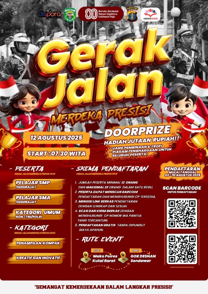 Kutai Barat – Dalam rangka menyambut Hari Ulang Tahun ke-80 Kemerdekaan Republik Indonesia, Polres Kutai Barat bekerja sama dengan Dispora dan Pemerintah Kabupaten Kutai Barat akan menggelar Gerak Jalan Merdeka Presisi 2025 yang akan dilaksanakan pada 12 Agustus 2025 mulai pukul 07.30 WITA.