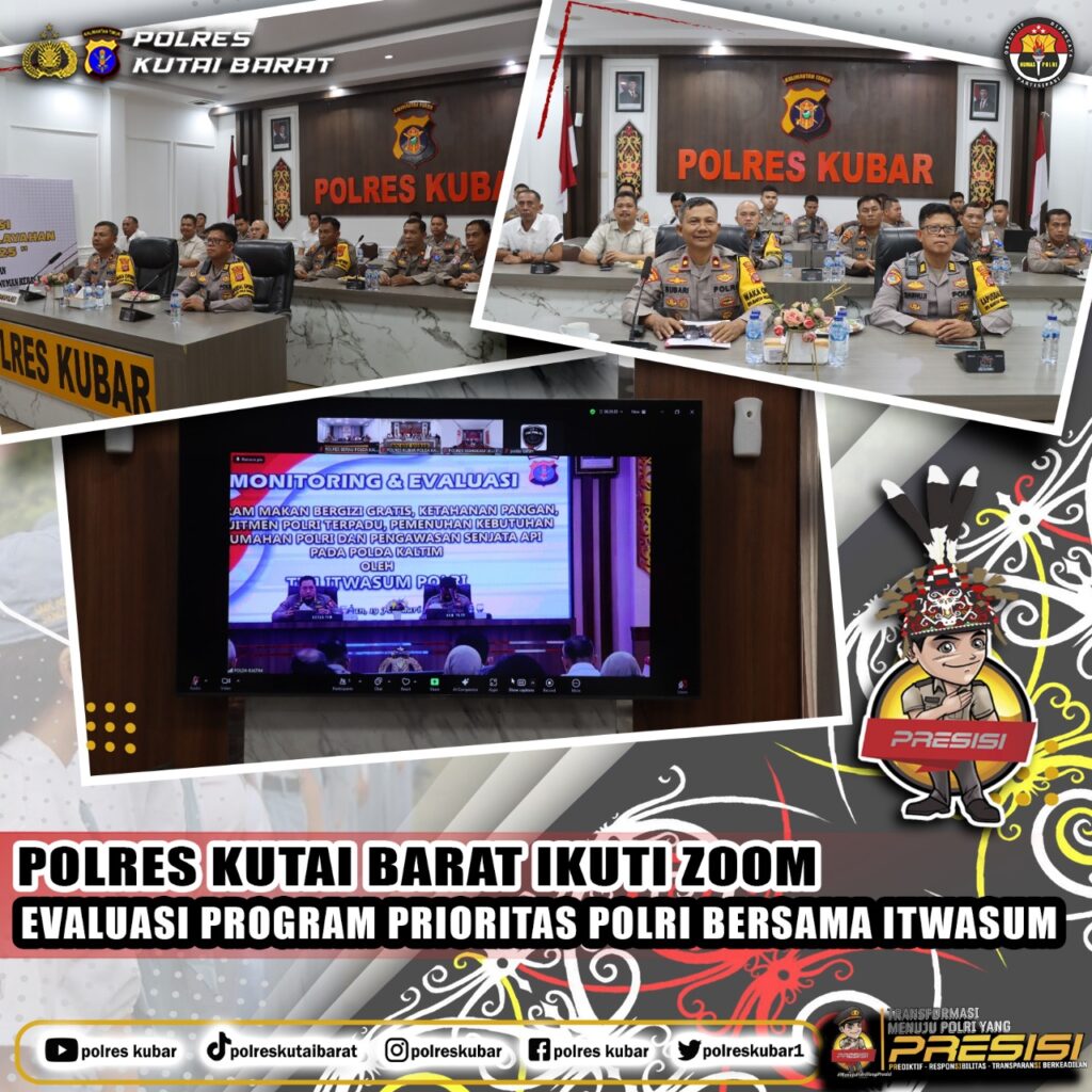 Kutai Barat, 19 Februari 2025 – POLRES KUTAI BARAT mengikuti Zoom Meeting terkait Monitoring dan Evaluasi Program Prioritas POLRI yang digelar oleh TIM ITWASUM POLRI. Kegiatan ini berlangsung di Aula Tribrata POLRES KUTAI BARAT, dipimpin oleh WAKAPOLRES KUTAI BARAT, KOMPOL SUBARI, S.Sos., M.H., serta dihadiri oleh para pejabat utama POLRES KUTAI BARAT.