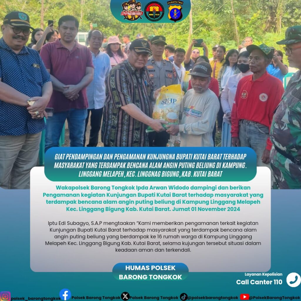 Kutai Barat – Polsek Barong Tongkok, diwakili oleh Wakapolsek Ipda Arwan Widodo, melakukan pendampingan dan pengamanan dalam kunjungan Bupati Kutai Barat, FX Yapan, SH, ke masyarakat terdampak angin puting beliung di Kampung Linggang Melapeh, Kecamatan Linggang Bigung, Jumat (01/11/2024).