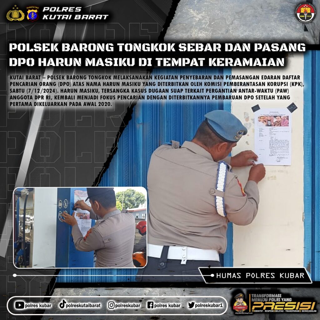 Kutai Barat – POLSEK BARONG TONGKOK melaksanakan kegiatan penyebaran dan pemasangan edaran Daftar Pencarian Orang (DPO) atas nama HARUN MASIKU yang diterbitkan oleh Komisi Pemberantasan Korupsi (KPK), Sabtu (7/12/2024). Harun Masiku, tersangka kasus dugaan suap terkait pergantian antar-waktu (PAW) anggota DPR RI, kembali menjadi fokus pencarian dengan diterbitkannya pembaruan DPO setelah yang pertama dikeluarkan pada awal 2020.