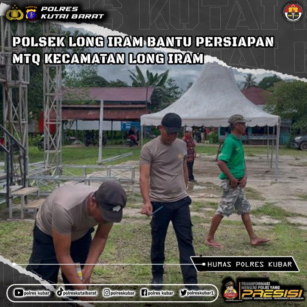 Polsek Long Iram bersama Kapolsek IPTU Andi Ahmad Salman, S.H., aktif mendukung persiapan Musabaqah Tilawatil Quran (MTQ) di Kecamatan Long Iram, Kabupaten Kutai Barat. Anggota Polsek Long Iram bergotong royong bersama masyarakat di lokasi utama kegiatan, dengan fokus pada pembersihan area dan pemasangan perlengkapan.