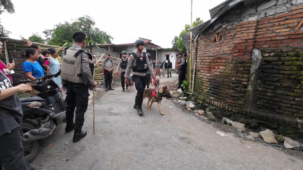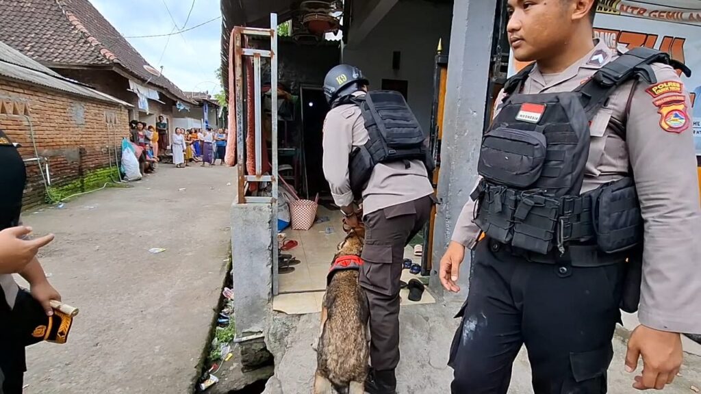 Enam personel Polsatwa beserta 3 ekor anjing pelacak khusus (Caksus) narkoba atau K-9 diturunkan untuk melakukan pencarian barang bukti barang haram perusak anak bangsa di kampung tersebut.