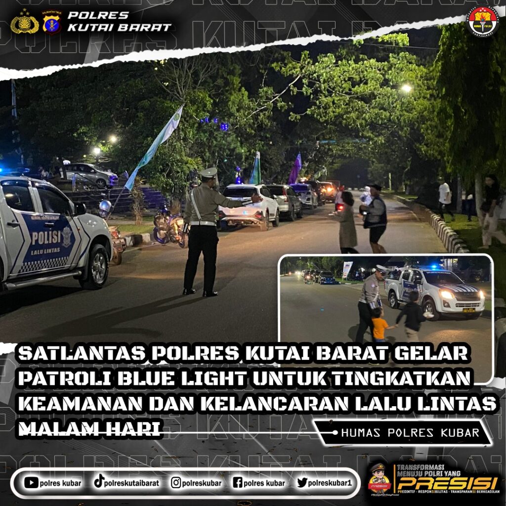 Kutai Barat – Satlantas Polres Kutai Barat menggelar patroli Blue Light untuk menjaga keamanan dan kelancaran lalu lintas di wilayah Kutai Barat pada Jumat malam, 1 November 2024. Patroli ini dipimpin oleh BRIPKA Jefri Paladang dan BRIPTU Yusup Triwahyudi, menyasar area Simpang Bisnis Center, Alun-Alun Itho, dan Taman Budaya Sendawar.