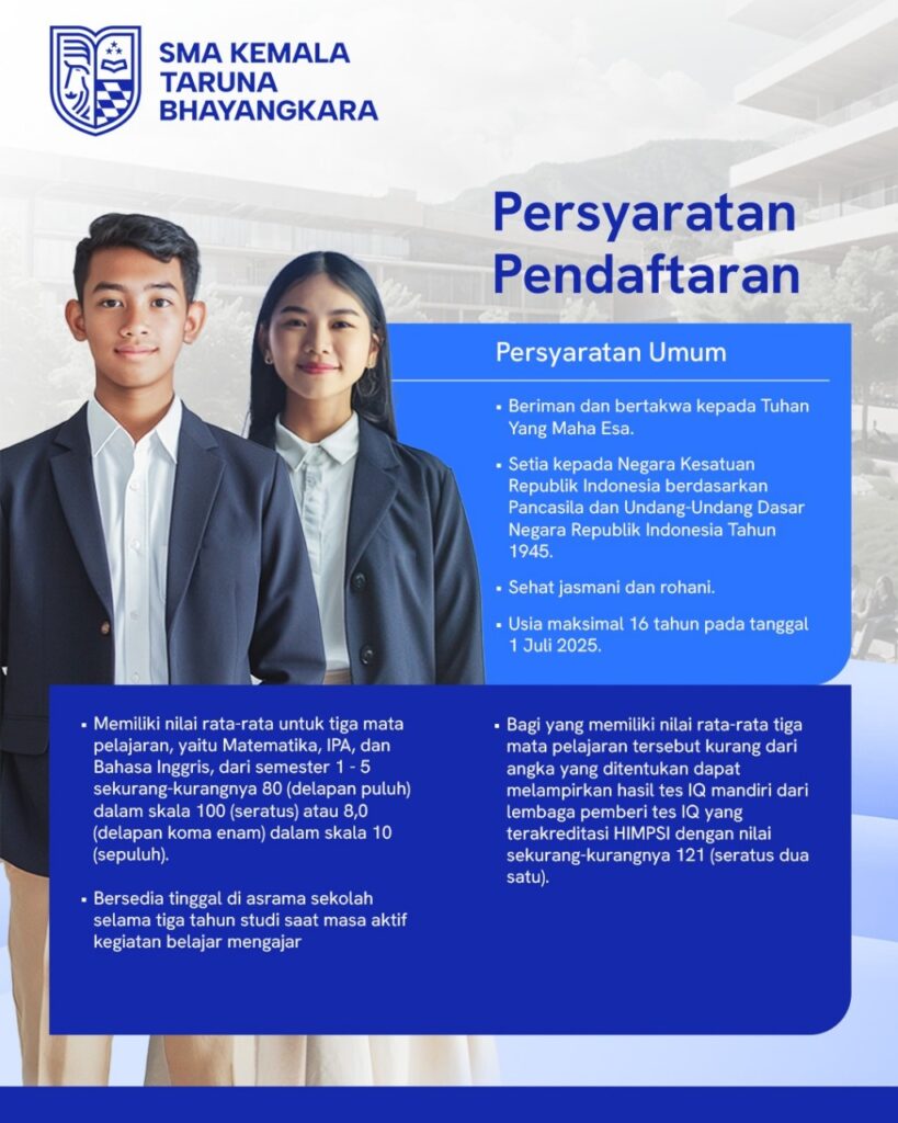SMA Kemala Taruna Bhayangkara mulai beroperasi pada tahun ajaran 2025-2026. Pendaftaran penerimaan peserta didik baru (PPDB) sudah dibuka mulai hari ini, ( Jumat, 27/12/2024) hingga 22 Januari 2025.