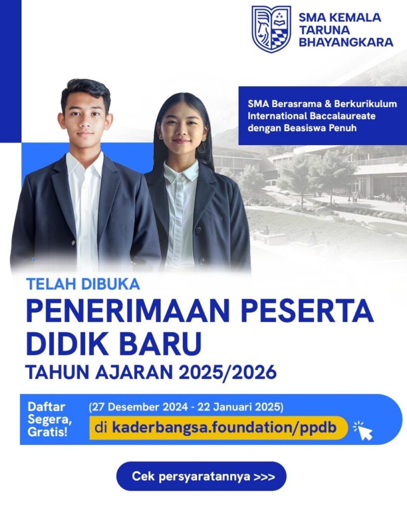 Bagi palajar yang berminat masuk SMA Kemala Taruna Bhayangkara, pendaftaran bisa dilakukan secara daring melalui tautan https://kaderbangsa.foundation/pp dengan link ini.